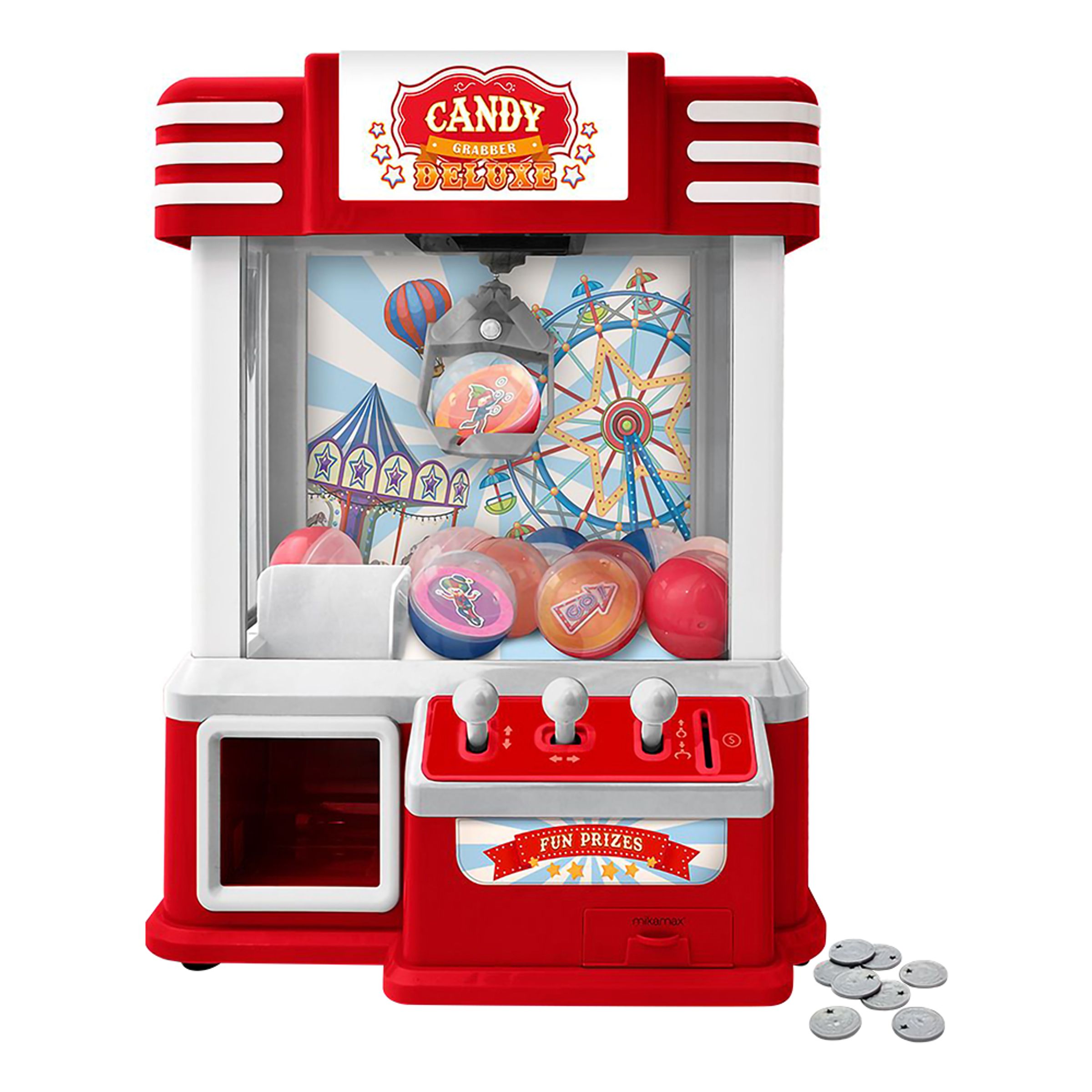 Godismaskin med Klo Deluxe är en riktigt festlig godisautomat som tar nöjespark-känslan till ditt hem. Automaten drivs med den medföljande USB-kabeln, alternativt tre stycken AA-batterier (medföljer ej), och kommer med 12 mynt, 10 prisbollar och 16 kort (att lägga i prisbollarna). Maskinen kommer med ljus och musik som kan justeras.